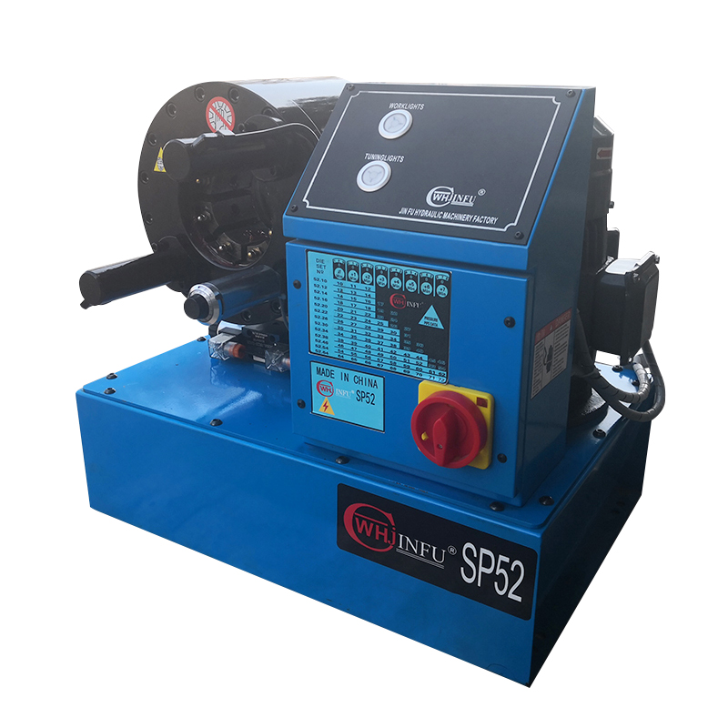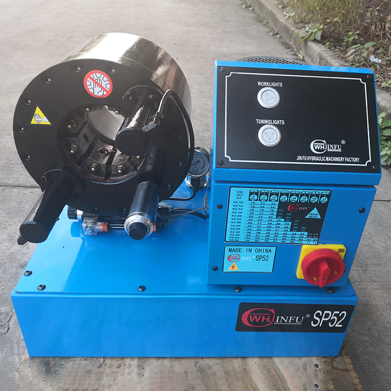 SP52壓管機(jī)(380V/220V)使用高壓柱塞油泵,壓力大,采用八瓣式模具, 模具采用強(qiáng)磁力安裝,具有結(jié)構(gòu)緊湊,操作簡單,油路設(shè)計(jì)先進(jìn),安裝簡單快捷,更換速度快,效率高,性能可靠,扣壓速度快,扣壓效果好等特點(diǎn)??蹓汗芊秶簝?nèi)徑6-51mm,適合一層至六層鋼絲的高壓油管,液壓油管,膠管,鐵氟龍管,金屬接頭的扣壓加工。